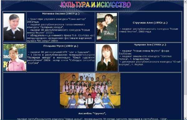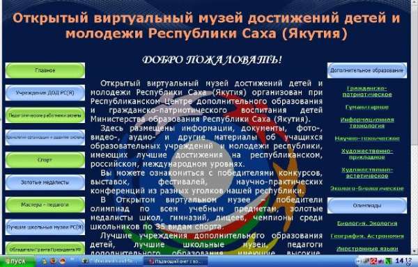 Открытый виртуальный музей достижений детей и молодежи Республики Саха (Якутия) организован при Республиканском Центре дополнительного образования и гражданско-патриотического воспитания детей Министерства образования Республики Саха (Якутия). Здесь размещены информации, документы, фото-, видео-, аудио- и другие материалы об учащихся образовательных учреждений и молодежи республики, имеющих лучшие достижения на республиканском, российском, международном уровнях. Вы можете ознакомиться с победителями конкурсов, выставок, фестивалей, научно-практических конференций из разных уголков нашей республики. В Открытом виртуальном музее – победители олимпиад по всем учебным предметам, золотые медалисты школ, гимназий, лицеев, чемпионы среди школьников по 35 видам спорта. Лучшие учреждения дополнительного образования детей, лучшие школьные музеи, педагоги дополнительного образования, имеющие высокие достижения в развитии детского творчества и мастера-педагоги также освещаются в нашем Виртуальном музее.